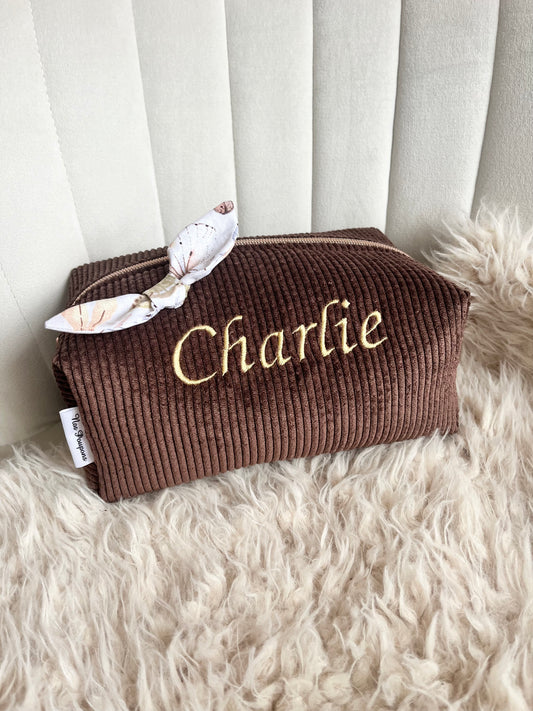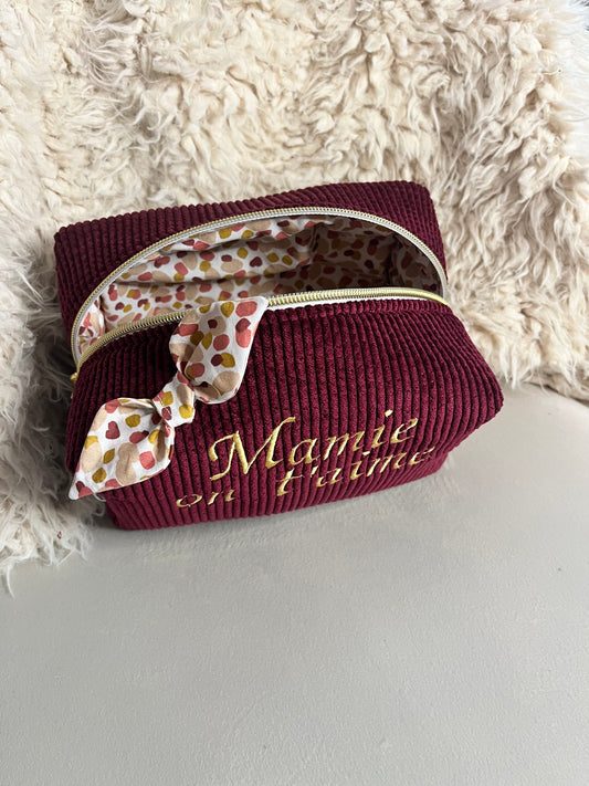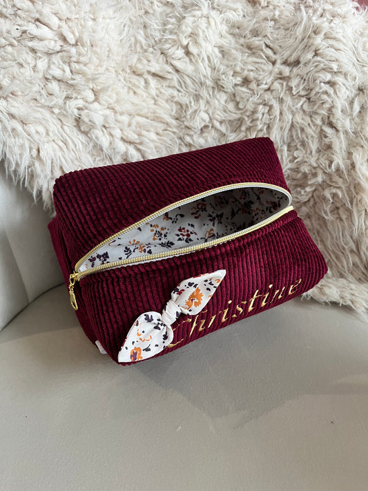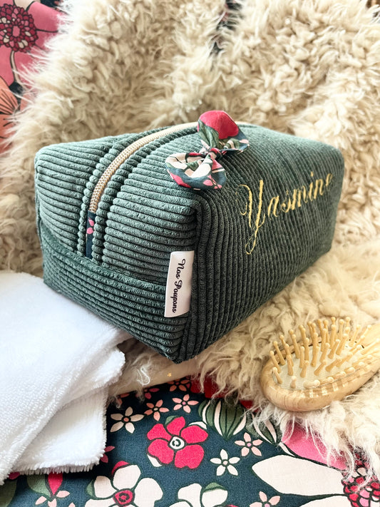 Notre trousse de maquillage en velours côtelé est la solution idéale pour ranger tous les essentiels de beauté et de soins des mamans.