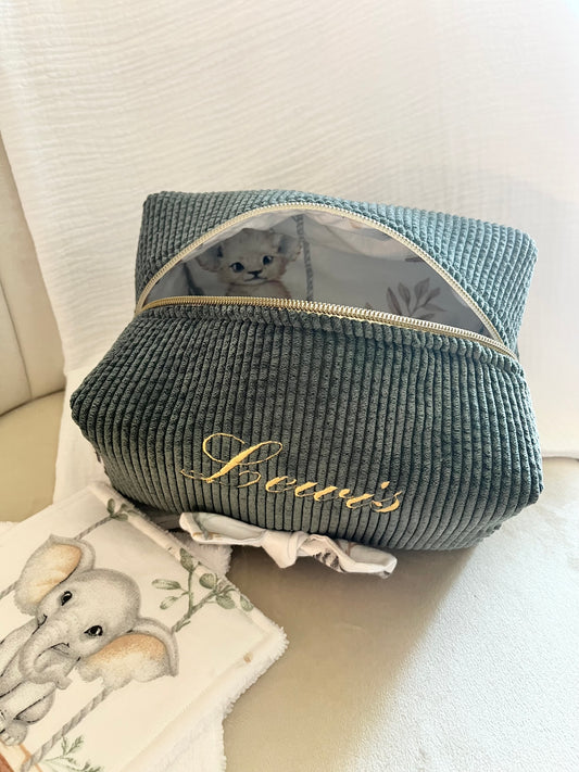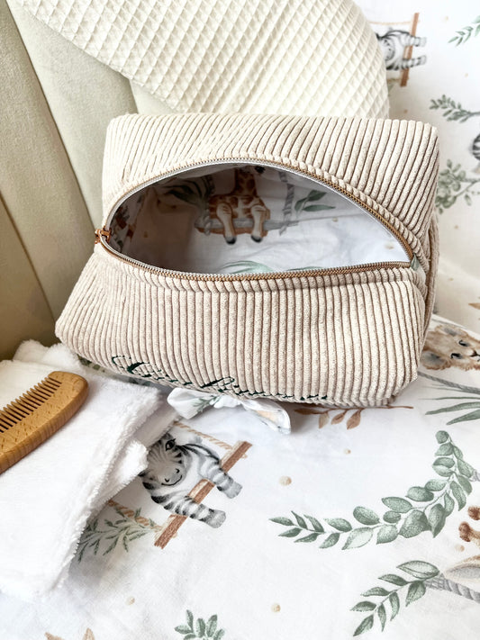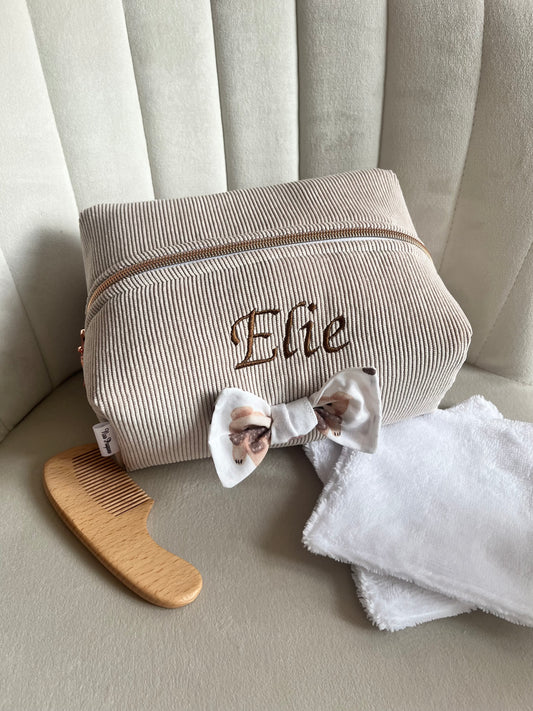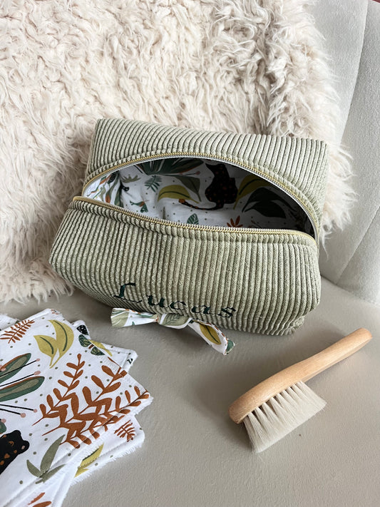 Notre petite trousse de toilette en velours côtelé est la solution idéale pour ranger tout le nécessaire de toilette de votre bébé (ou comme trousse de maquillage pour les mamans).